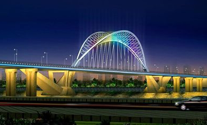 現(xiàn)代的大橋,多系現(xiàn)代化的鋼索斜拉橋,有雙塔斜拉、單塔斜拉。斜拉橋的外形特色在于拉索。大橋的照明將以重點(diǎn)突出這一特色為主,用不同的燈具及匠心獨(dú)具的藝術(shù)手法,一架碩大的豎琴屹立在大江、大河之上。為了烘托大橋的節(jié)目氣氛的整體效果,在橋上兩旁沿馬路,每4-5米可以放置1個(gè)藝術(shù)燈具,使之鏈成一條閃光的珍珠項(xiàng)鏈。對(duì)主塔的立面泛光照明可分三個(gè)方面:由下面上投時(shí),要把整個(gè)主塔照得晶瑩透徹、潔白無(wú)瑕,雄偉壯觀這是大橋景觀的重中之重。為了使主塔全部都照亮,透視效果好,應(yīng)該還要在路面下設(shè)置平臺(tái)。用泛光燈由上向下照亮水面上部的塔基部分,使高塔的照明效果宛如一個(gè)巨人屹立在河水之上。