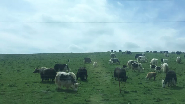 看慣了家鄉(xiāng)的山山水水,這樣毫不掩飾地坦露的自然美景、展示著大自然的本來面目,無意間給人一種震憾,一種真實(shí),一種坦蕩;草地上大群的白色山羊和黑色的牦牛低著頭吃草,在這驕陽似火的七月,站在海拔3520米的日月山山口,凜冽的寒風(fēng)急掠而過,竟然令人瑟瑟發(fā)抖。下車,在頂峰日月山碑旁大家拍照留念,心曠神怡。