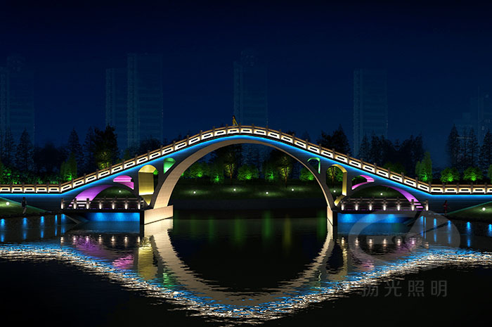 石拱橋、景觀橋是橋墩和橋身自然地連接為一體,而且體量不是特別大,所以采用泛光照明時(shí),一般是將橋身側(cè)面和橋墩側(cè)面一并照亮,通過(guò)將泛光燈具設(shè)置在河兩岸靠近橋墩處,與橋身側(cè)面成一定角度向橋身投光。